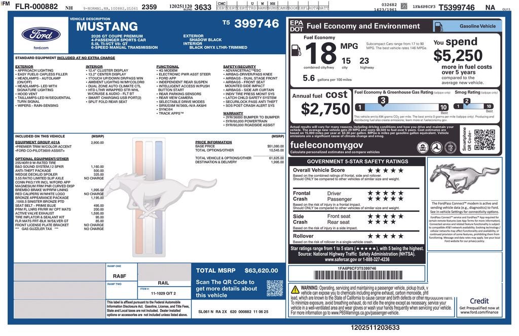 2026 Ford Mustang GT Premium Shadow Black 5.0L V8 Ti-VCT 2D Coupe