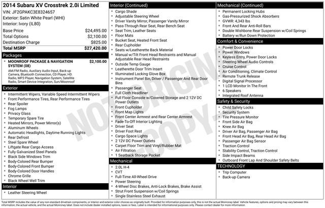 **NO DEALER FEES**. 2014 Subaru XV Crosstrek 2.0i Limited Satin White Pearl 2014 Subaru XV Crosstrek 2.0i Limited AWD Lineartronic CVT 2.0L 16V DOHC