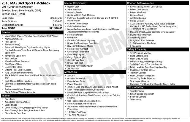 **NO DEALER FEES**. 2018 Mazda Mazda3 Sport Sonic Silver Metallic 2018 Mazda Mazda3 Sport FWD 6-Speed Automatic SKYACTIV®-G 2.0L 4-Cylinder DOHC 16V