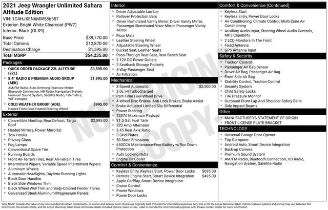 **NO DEALER FEES**. 2021 Jeep Wrangler Unlimited Sahara Altitude Clean CARFAX. Bright White Clearcoat 2021 Jeep Wrangler Unlimited Sahara Altitude 4WD 8-Speed Automatic 2.0L I4 DOHC