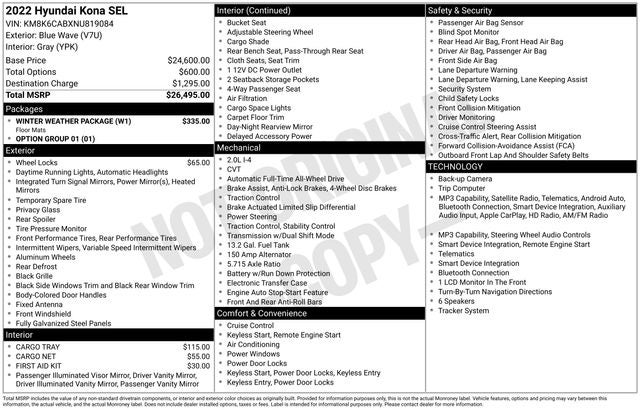 **NO DEALER FEES**. 2022 Hyundai Kona SEL Clean CARFAX. Blue Wave 2022 Hyundai Kona SEL AWD CVT 2.0L I4 MPI DOHC 16V LEV3-ULEV70 147hp