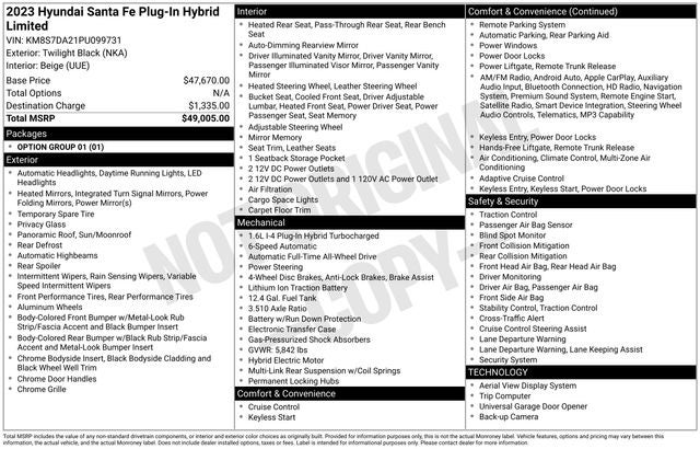 **NO DEALER FEES**, I4. 2023 Hyundai Santa Fe Plug-In Hybrid Limited Black Noir Pearl 2023 Hyundai Santa Fe Plug-In Hybrid Limited AWD 6-Speed Automatic with Shiftronic I4